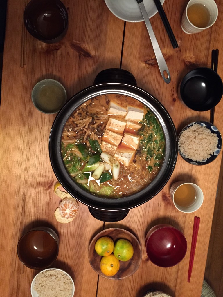 Yesterday we made nabe – basically a large pot full of stewed vegetables, mushrooms, miso, etc. This morning Eri made zosui – the leftover liquid from the nabe mixed with rice.